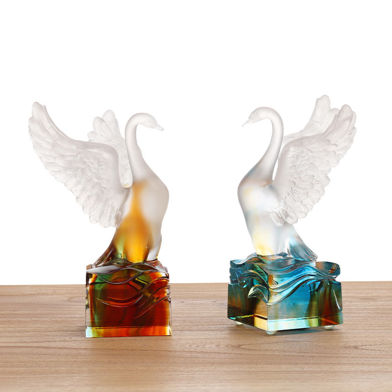 Farblich weist der Glasschwan ein Farbverlaufsdesign auf, das allmählich vom Weiß des Kopfes zum Orange-Gelb des Körpers und dann zum Dunkelrot der Basis übergeht. Dieser Farbwechsel verstärkt nicht nur die visuelle Schichtung, sondern verleiht dem Schwan auch ein warmes und feierliches Temperament.