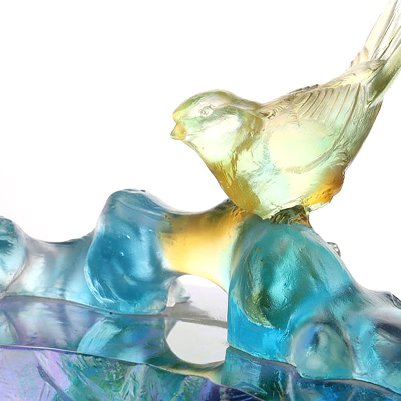 Der Obstteller ist außerdem mit lebensechten Glasvögeln und anderen Glasobjekten verziert, was dem gesamten Obstteller etwas Verspieltheit und Beweglichkeit verleiht. Wenn leuchtend rote Weintrauben und runde Äpfel hineingelegt werden, ergänzen sich die leuchtenden Farben der Früchte und die kühlen Töne der Glasplatte und ergeben eine optisch harmonische Schönheit.